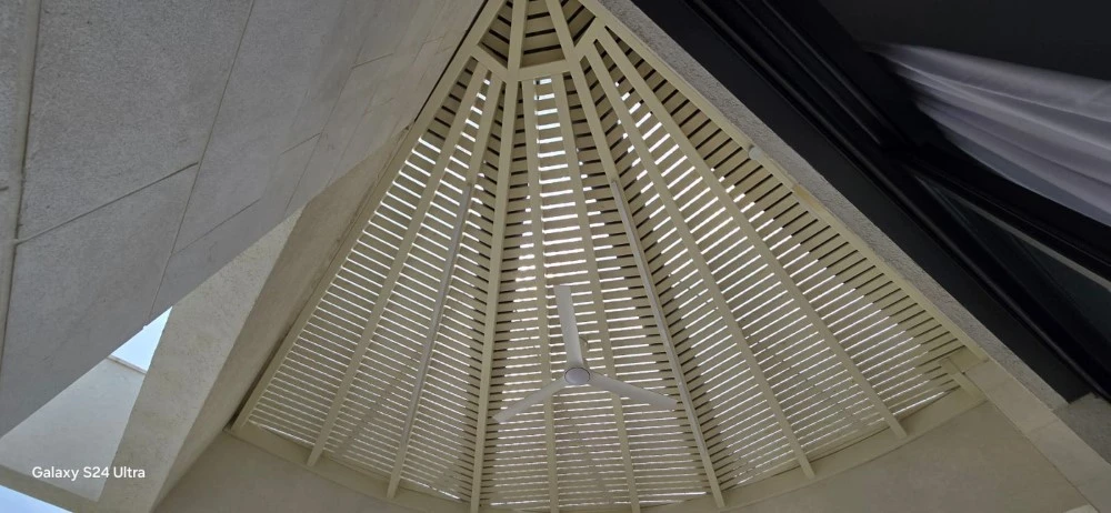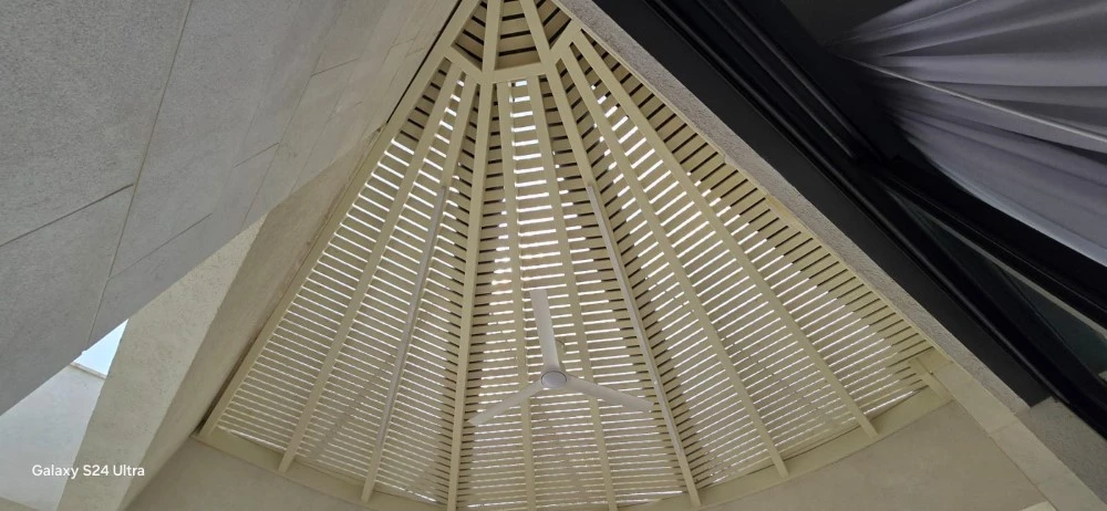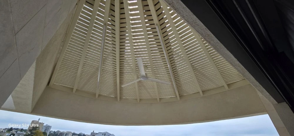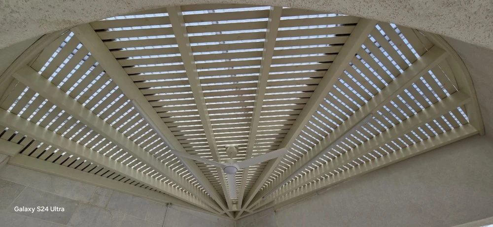 פרויקט פרגולת עץ גושני בצורת מניפה משפחת ממן בחיפה